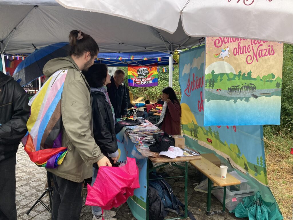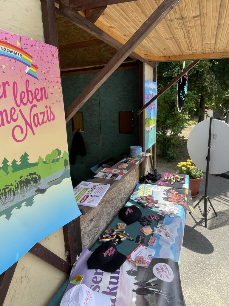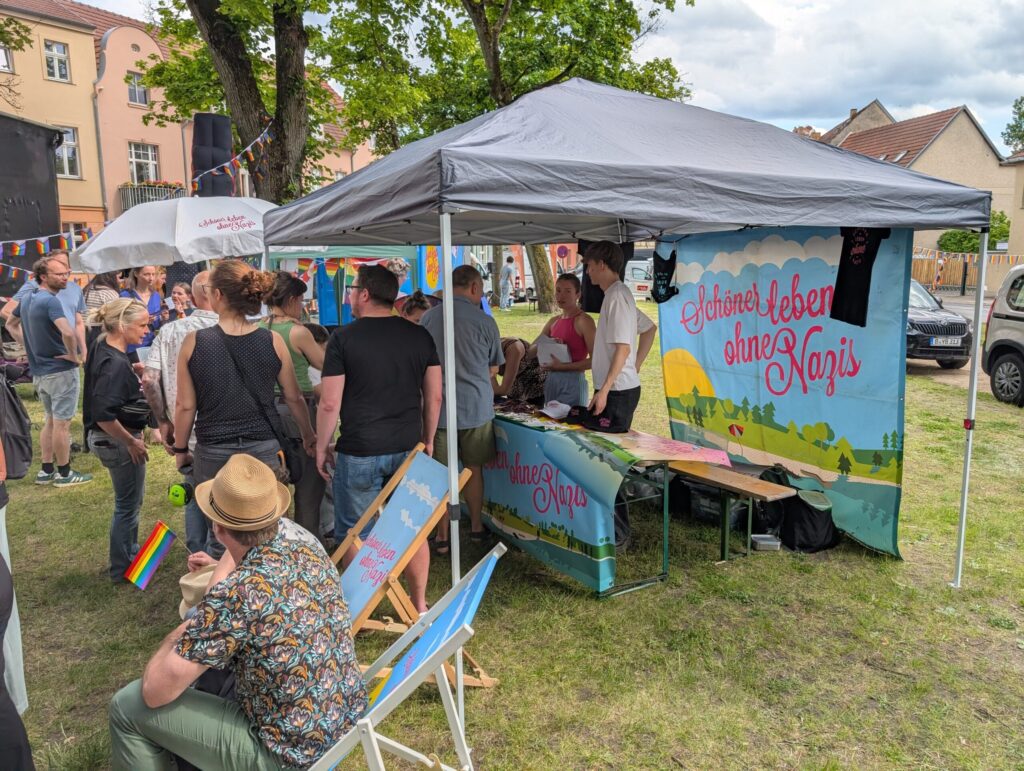 Unter dem Motto „Regenbogensommer“ tourte der Aktionsstand von „Schöner leben ohne Nazis“ durch Brandenburg und machte an 14 Stationen Halt – von Jugend- und Demokratiefesten über Kultur- und Sportevents bis hin zu Christopher Street Days, auch in ländlichen Regionen.